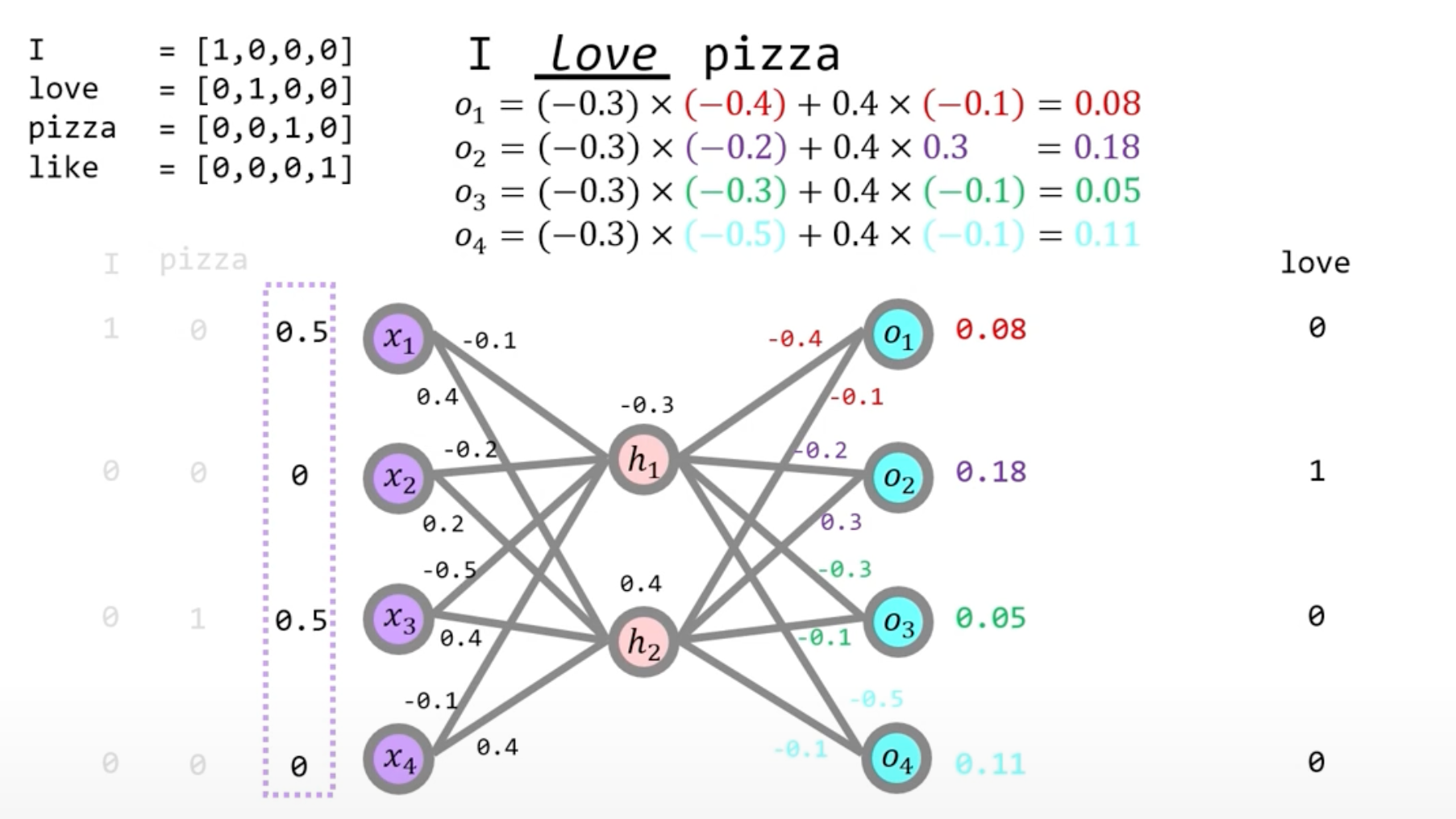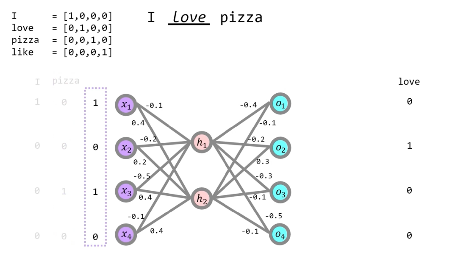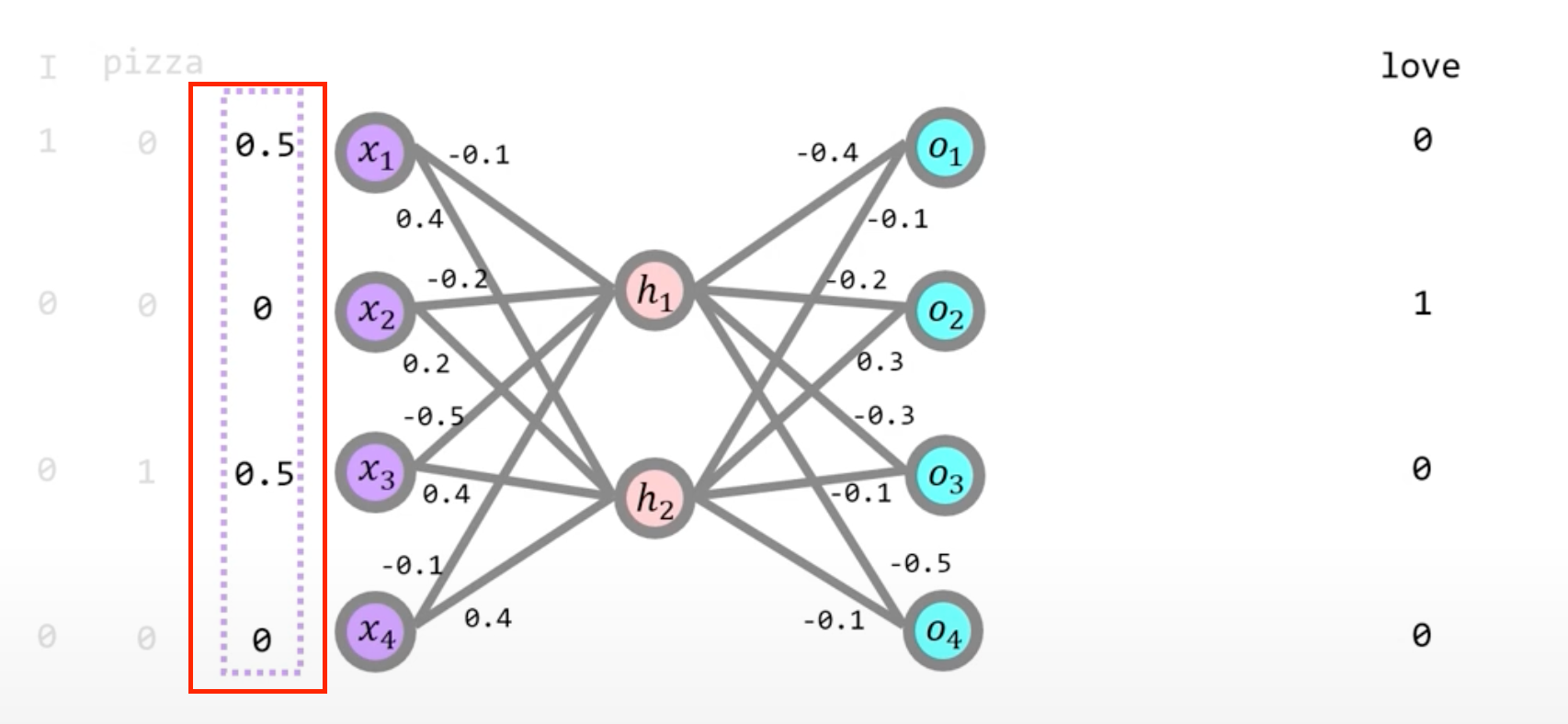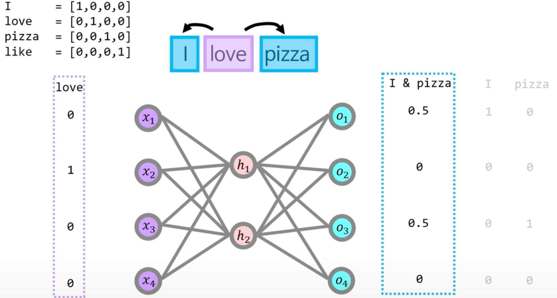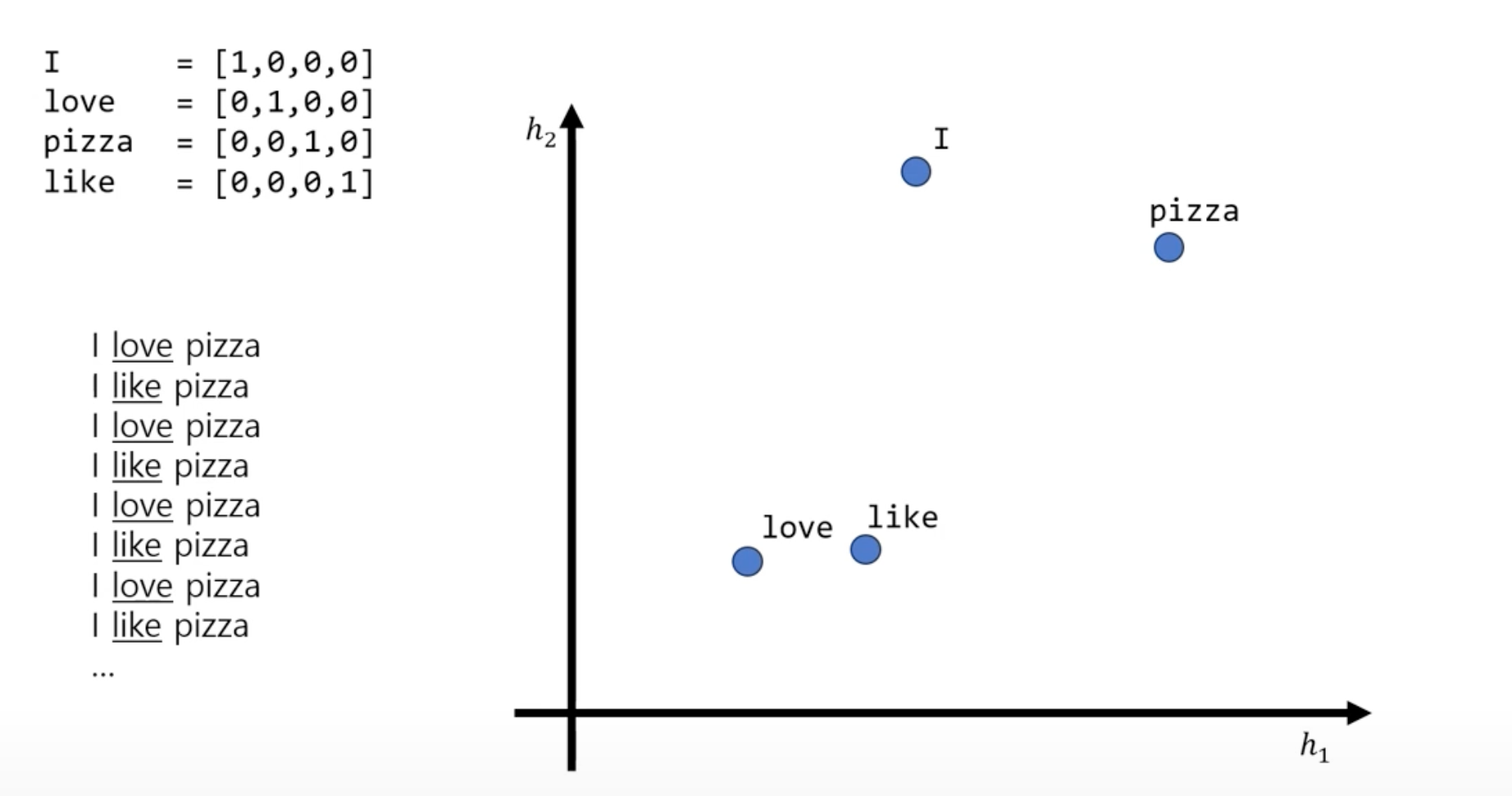 - 예를 들어서 I love Pizza Like 라는 단어를 신경망을 통해 학습 한다면