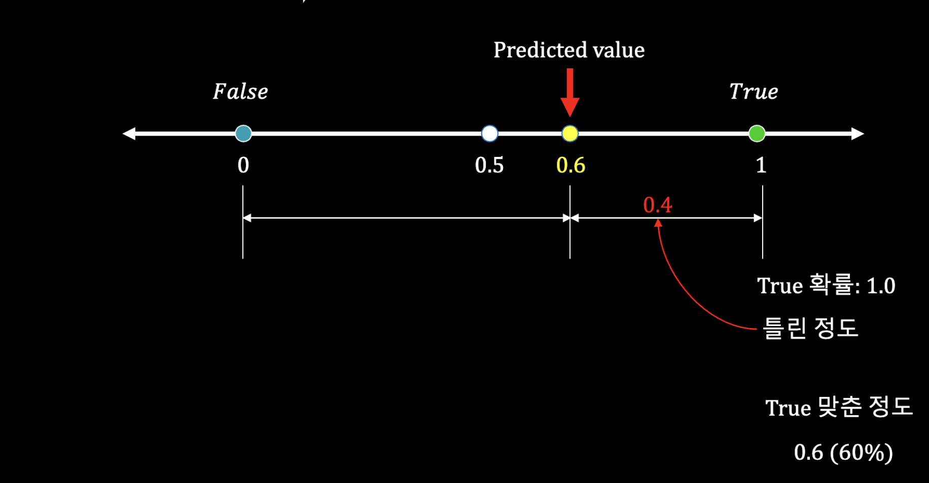 0.5 임계 값을 통해 True(1)로 출력 되는 것은 맞지만 결국 틀린 양으로 계산해보았을 때 1 - 0.6 = 0.4 만큼 틀린 경우라고 볼 수 있다.