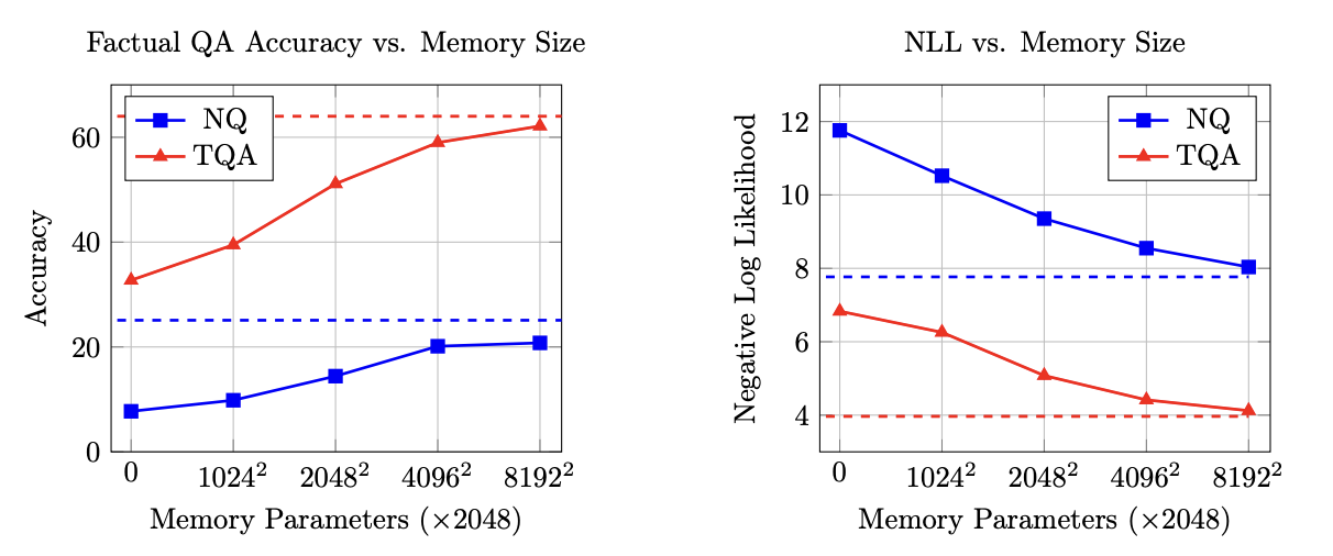 - 대규모 스케일에서 메모리 레이어의 실용성을 입증했으며, 1조개의 토큰으로 훈련된 1,280억개의 메모리 파라미터를 사용하는 모델을 선보임