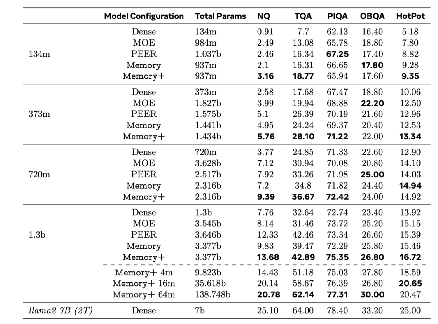 - 메모리 레이어(Memory, Memory+)는 Dense 및 MOE 모델보다 전반적으로 더 나은 성능을 보여줌.