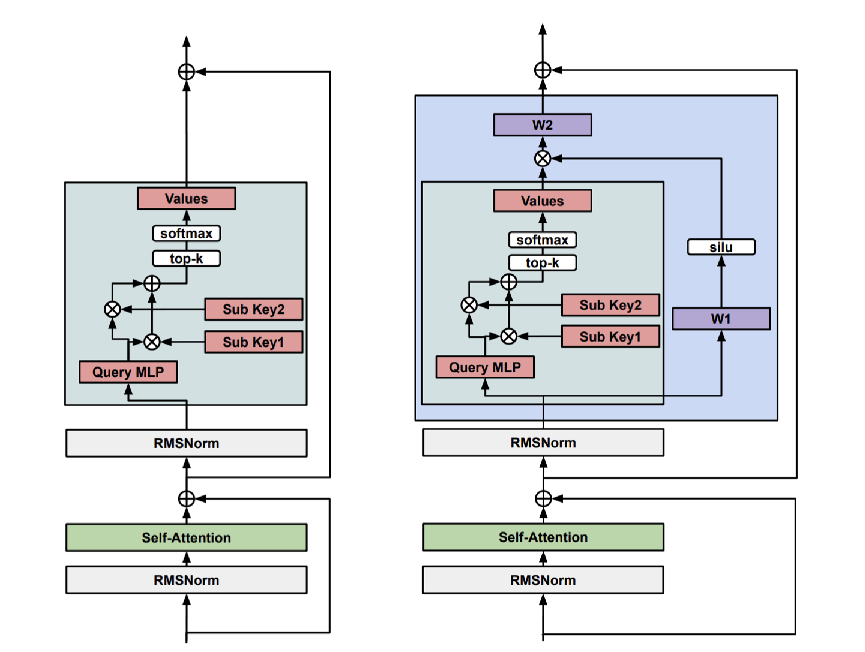 - 오른쪽 (개선된 레이어): 추가적인 W1, W2 레이어와 SiLU 활성화, Residual Connection을 통해 더 나은 성능, 안정성, 확장성을 제공함.