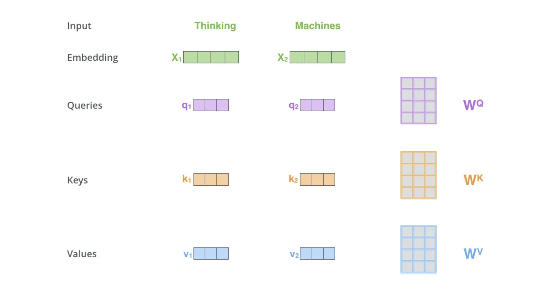 입력 임베딩 \(x_1\), \(x_2\)는 각각 3개의 선형 변환(가중치 행렬 \((W^Q, W^K, W^V)\)을 통해 \(Query (q_1, q_2), Key (k_1, k_2), Value (v_1, v_2)\) 벡터로 변환됩니다.