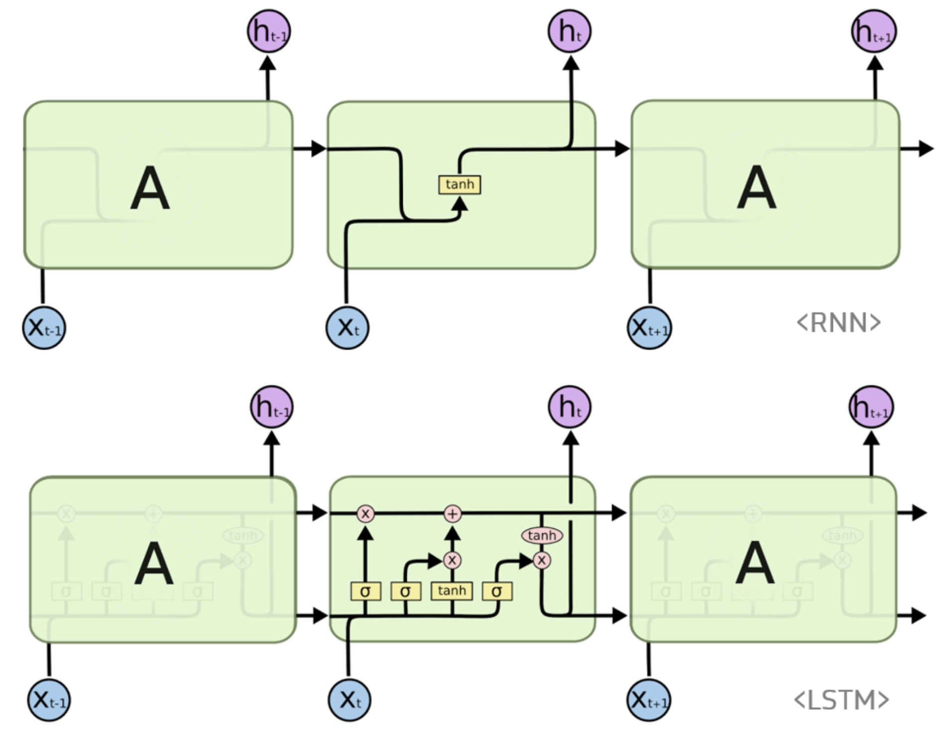 - 현재의 은닉층 값 \(h_t\)은 input \(x_t\)와 직전 은닉층 \(h_{t-1}\)을 입력으로 받음