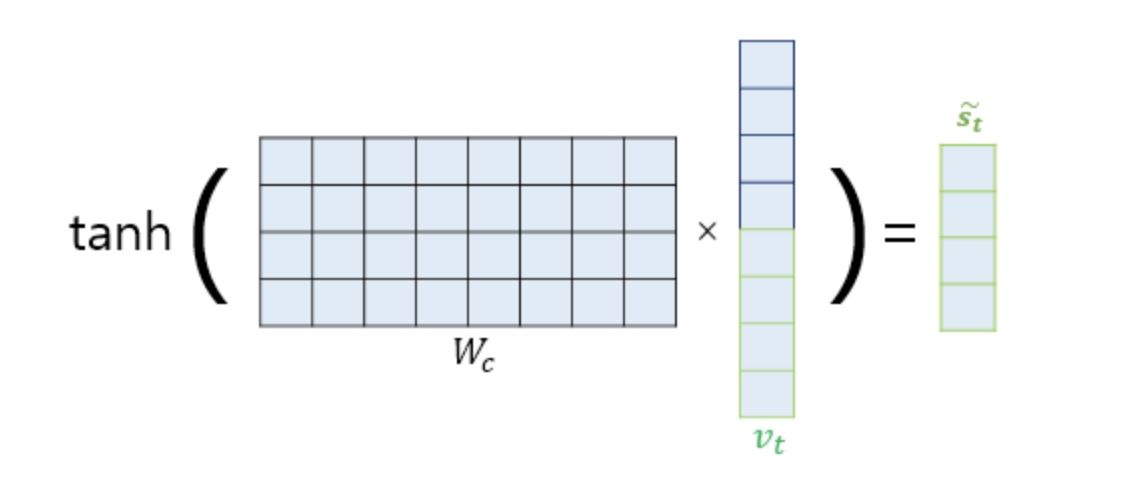 3. 디코더와 결합 : \(\tilde{s}_t = \tanh(W_c \cdot [s_t; c_t])\)