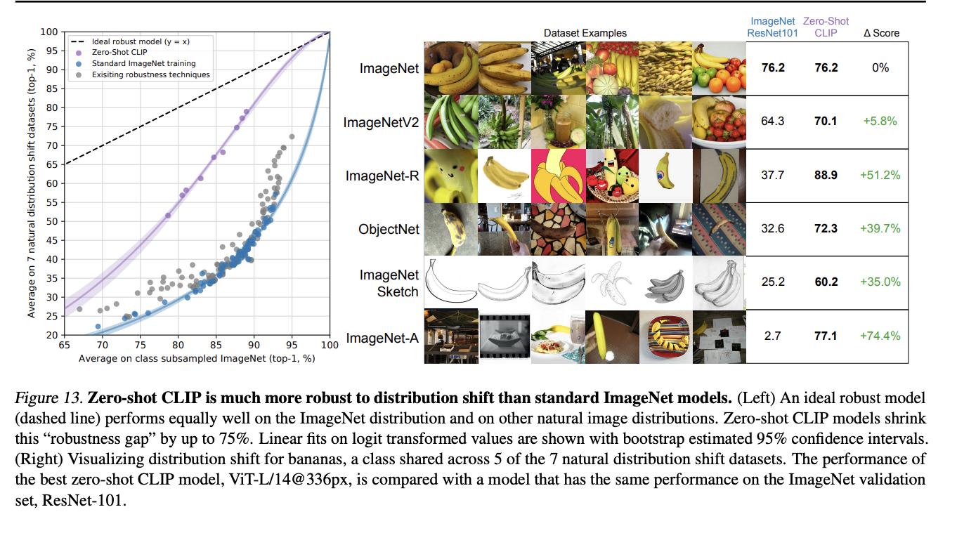 ResNet101과 비교하여, CLIP은 zero-shot 성능을 위 데이터셋에서 비교했을 때 훨씬 더 성능이 높음을 알 수 있다. 즉, distribution shift에 상당히 강건하다는 표현을 사용합니다(Robust)
