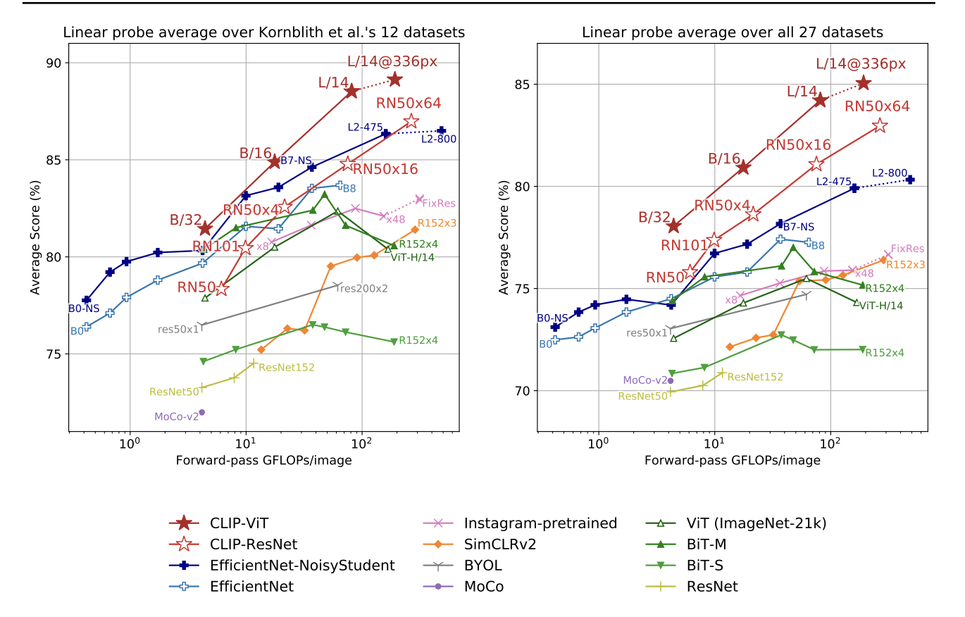 모델의 representation learning 성능은 뽑아진 representation을 선형모델에 넣은 성능으로 평가하며, CLIP 논문에서도 이와 같은 방법을 사용하였습니다.