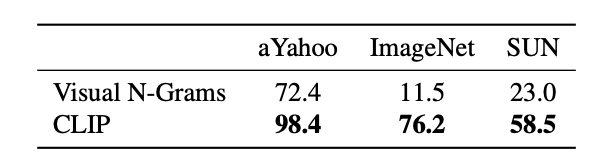 이미지 분류 문제에서 Visual N-grams 방식보다 실험한 3개의 데이터셋 모두에서 zero-shot 성능이 훨씬 뛰어나다.