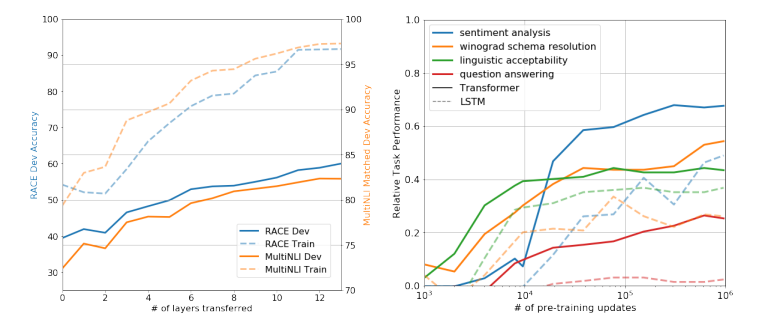 - MultiNLI와 RACE 태스크에서 전이된 Transformer 레이어 수에 따른 성능 변화