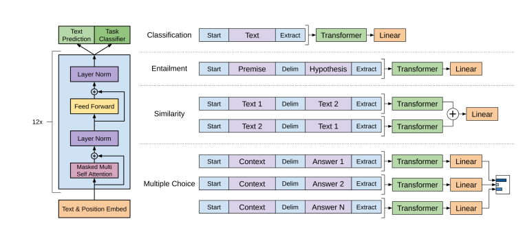 GPT는 원래 연속적인 텍스트를 학습 하도록 사전 훈련 되었으나, 하지만 일부 태스크에서는 구조화 된 입력이 필요하므로, 기존 모델 구조를 크게 변경하지 않고도 이를 처리할 수 있도록 입력 변환(Input Transformation) 을 전환 함