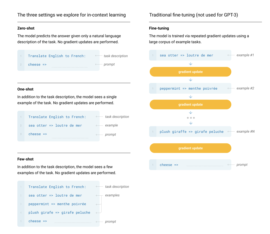 이러한 단점을 딛고 GPT-3에서는 Few-shot, One-shot, Zero-shot등의 다양한 학습 태스크를 통해 능동적으로 학습하는 모델을 지향하며 만들게됨