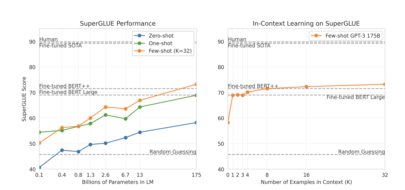 - GPT-3는 대부분의 SuperGLUE 하위 과제에서 few-shot 설정 시 점진적으로 향상된 성능 보임