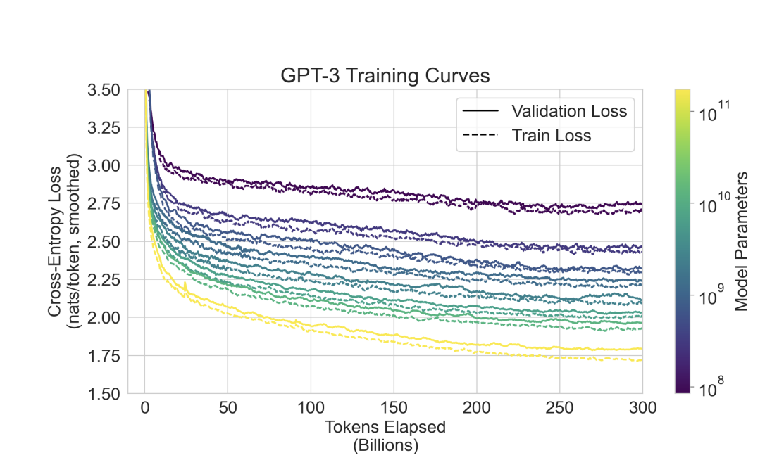 아래 그래프는 GPT-3의 학습 과정에서 측정된 Train Loss(점선)와 Validation Loss(실선)를 모델 크기별로 보여줌.