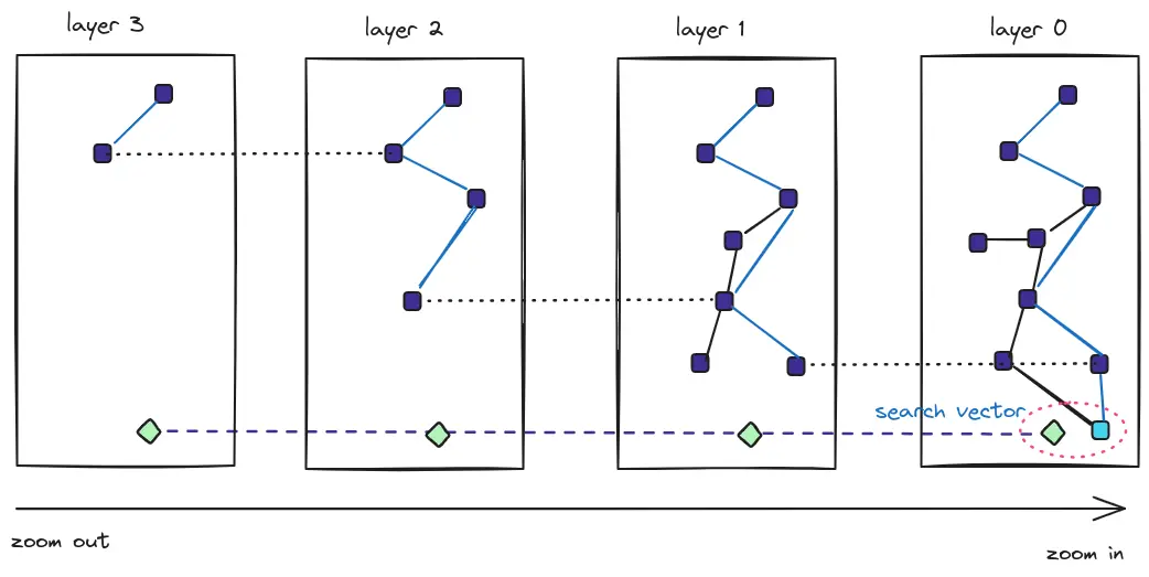 HNSW 인덱스는 여러개의 레이어로 이루어진 다층 그래프 구조를 사용하여 벡터 검색을 수행하는 알고리즘 입니다. "작은세상" 네트워크 이론에 기반해서, 각 노드가 멀리 떨어진 노드들과도 연결되어 있어서 빠른 탐색이 가능합니다.