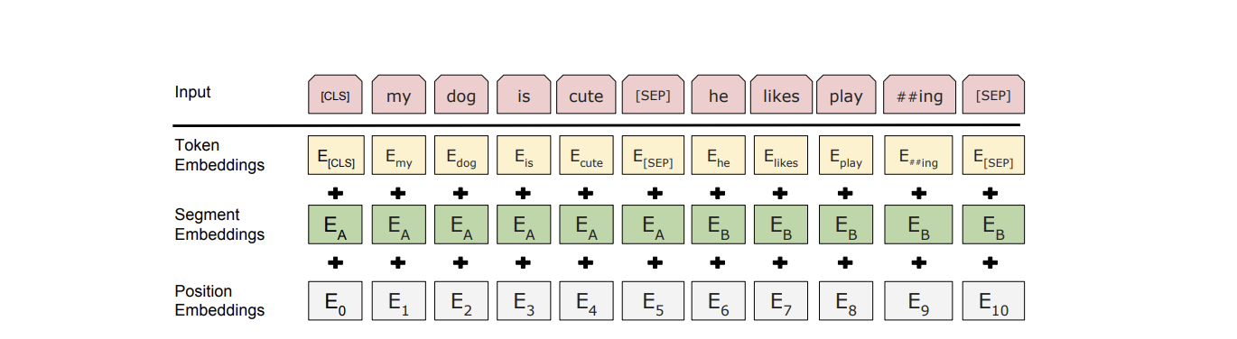 - Position Embedding : 두 개의 문장을 구분하기 위한 임베딩, 임베딩 벡터의 종류는 문장의 최대 개수인 2개.